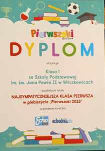 Warto się pochwalić, iż klasa pierwsza ze Szkoły Podstawowej im. św. Jana Pawła II w Wilczkowicach została laureatem I miejsca w powiecie koneckim w plebiscycie Echa Dnia „Pierwszaki 2023” - „Najsympatyczniejszą Klasę Pierwszą” i V miejsca w województwie świętokrzyskim.