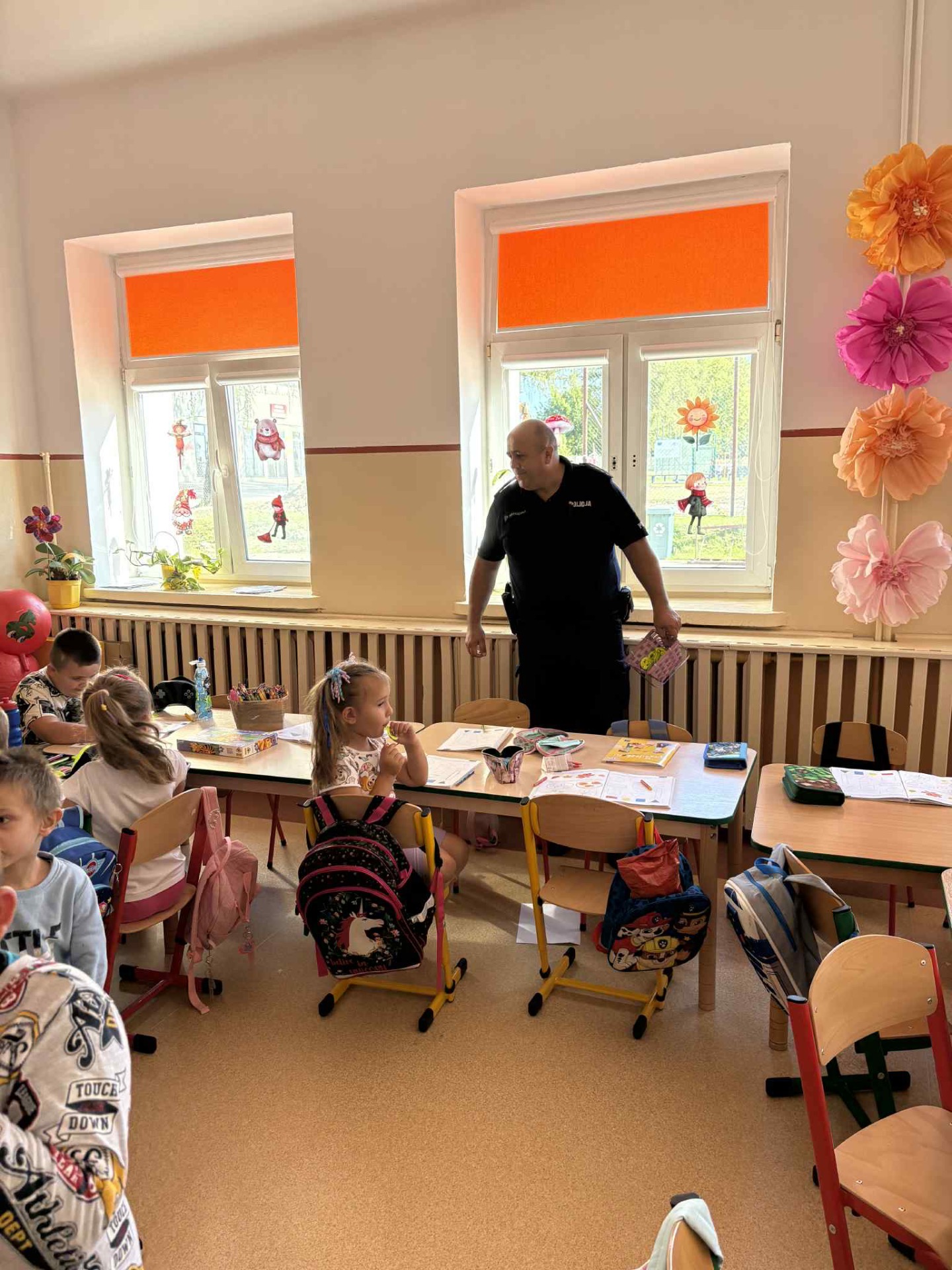 Uczniowie klas młodszych otrzymali od funkcjonariusza odblaski, które mają zwiększyć ich widoczność i bezpieczeństwo podczas poruszania się po drogach.