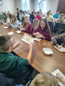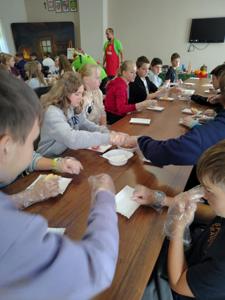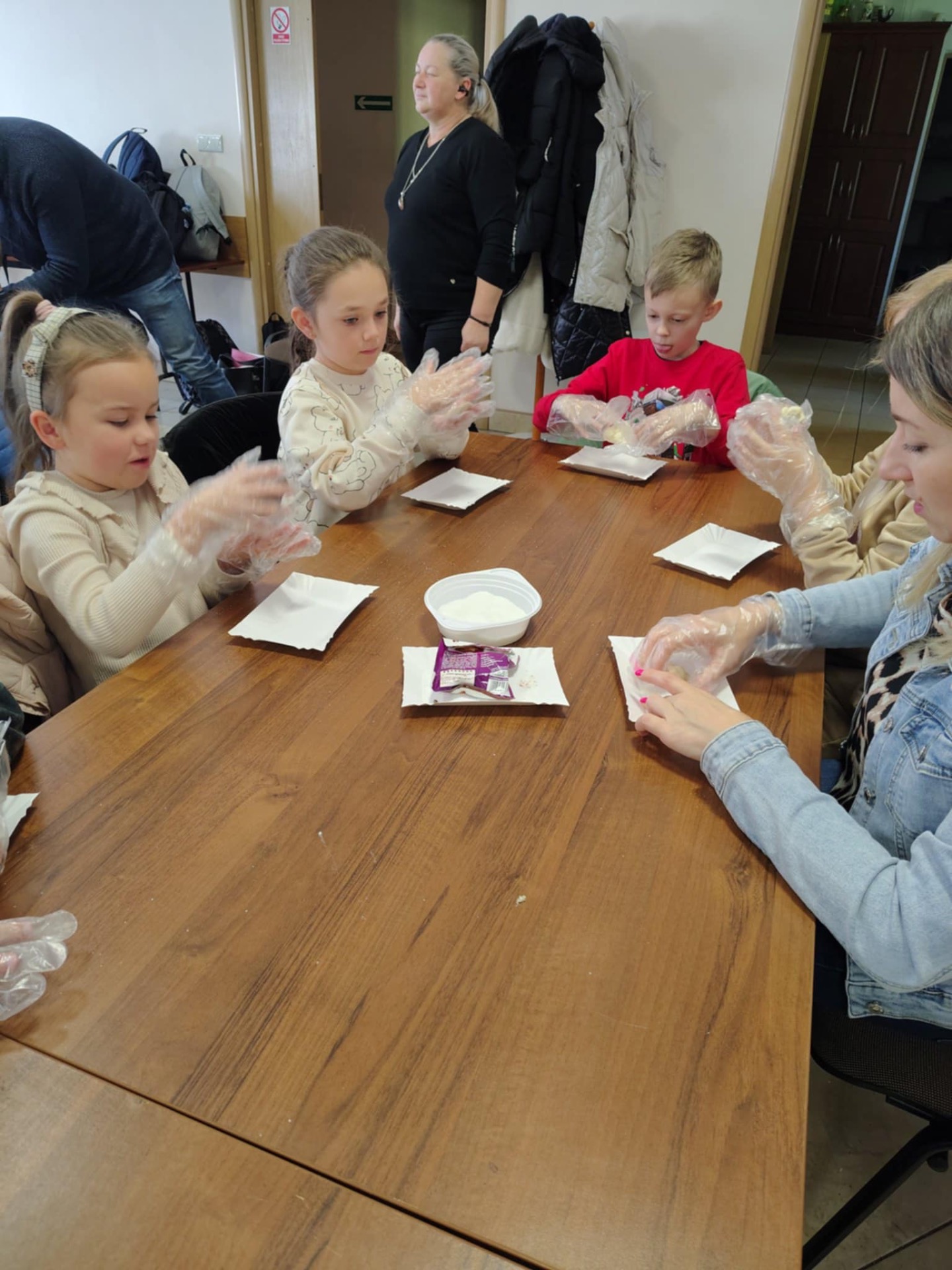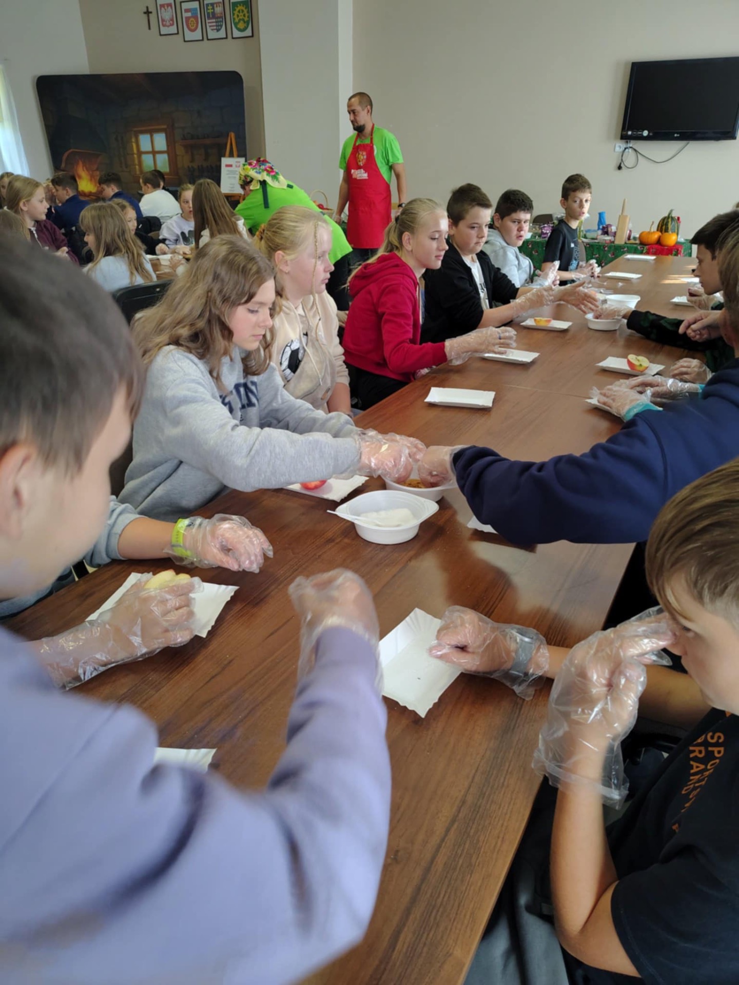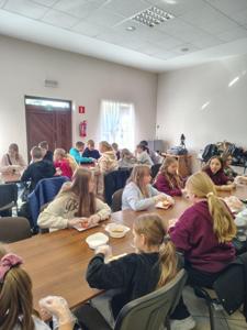 Po dotarciu na miejsce uczniów przywitali członkowie Koła Gospodyń i Gospodarzy Wiejskich „Podlesie”, którzy poprowadzili dla nich pełne zaangażowania warsztaty kulinarne. Dzieci miały okazję samodzielnie przygotować pieczone jabłuszka z cynamonem — pachnące, słodkie przysmaki, które cieszyły i oczy, i podniebienia. Własnoręcznie uformowały i upiekły macę, a także kisiły kapustę, poznając proces fermentacji, „pracę mikroorganizmów” i smak naturalnej kwasówki. Warsztaty te pozwoliły uczniom doświadczyć tradycyjnej kuchni, poczuć radość z działania własnych rąk, uczyć się cierpliwości i szacunku do lokalnych tradycji kulinarnych.