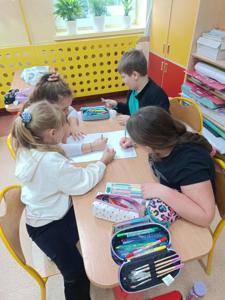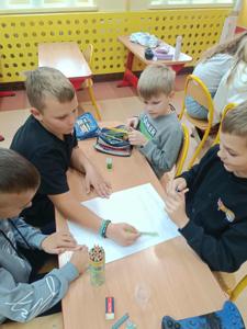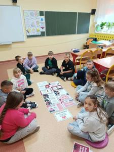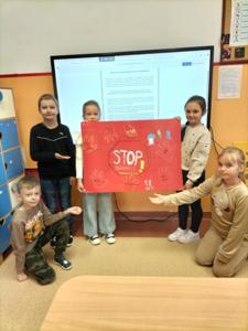 W klasach I – III przeprowadzono wiele różnorodnych działań, które miały na celu zwiększenie świadomości uczniów na temat zjawiska przemocy, uczenie właściwych sposobów reagowania na trudne sytuacje oraz kształtowanie postaw empatii i szacunku wobec innych. Zajęcia rozpoczęły się od rozmów o formach przemocy, podczas których uczniowie wspólnie zastanawiali się, czym różni się przemoc fizyczna od słownej, jak można kogoś zranić słowem, gestem lub brakiem akceptacji. Dzieci chętnie dzieliły się swoimi spostrzeżeniami i doświadczeniami, ucząc się przy tym rozumienia emocji własnych i cudzych. Zorganizowano „Dzień grzeczności” oraz konkurs na komiks „Stop przemocy”. Podczas zajęć uczniowie poznali dwie bajki edukacyjne – „Bajka o słowach, które ranią” oraz „Owce w sieci”, rysowali emocje, tworzyli plakaty „Mówimy NIE przemocy!”, a także uczestniczyli w zabawach „Komplementowy krąg”. Powstał też Słoik Dobrych Słów – miejsce, do którego dzieci wrzucały kartki z pozytywnymi wiadomościami dla innych. Na zajęciach omawiano również zasady bezpieczeństwa w sieci oraz reagowania na cyberprzemoc. Wszystkie klasy spotkały się z funkcjonariuszem Policji, który omówił temat przemocy rówieśniczej. Policjant podkreślił także znaczenie bezpieczeństwa w sieci i odpowiedzialności za własne zachowanie. Uczniowie aktywnie uczestniczyli w rozmowie, zadawali pytania i z zainteresowaniem słuchali przykładów z życia codziennego.