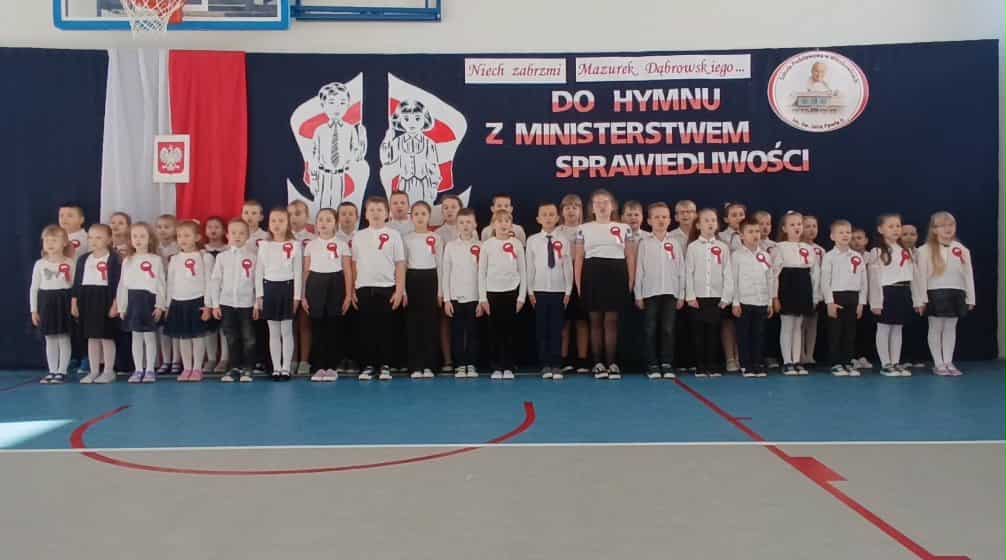 Uczniowie klas I–III oraz dzieci z oddziału przedszkolnego pod opieką wychowawców pań: Sylwii Ciszek, Eweliny Pakuły, Joanny Ściegiennej i Aleksandry Kowalczyk wzięli udział w konkursie „Do hymnu z Ministerstwem Sprawiedliwości” organizowanym przez Ministerstwo Sprawiedliwości. Dzieci, odświętnie ubrane, stojące w pozycji „na baczność” i patriotycznej scenerii, odśpiewały cztery zwrotki „Mazurka Dąbrowskiego”, ucząc się przy tym o symbolach narodowych i historii Polski.