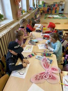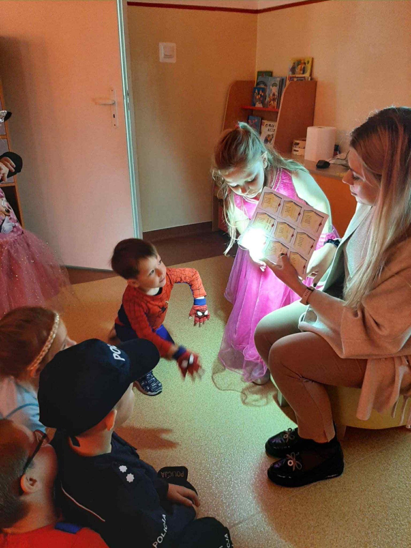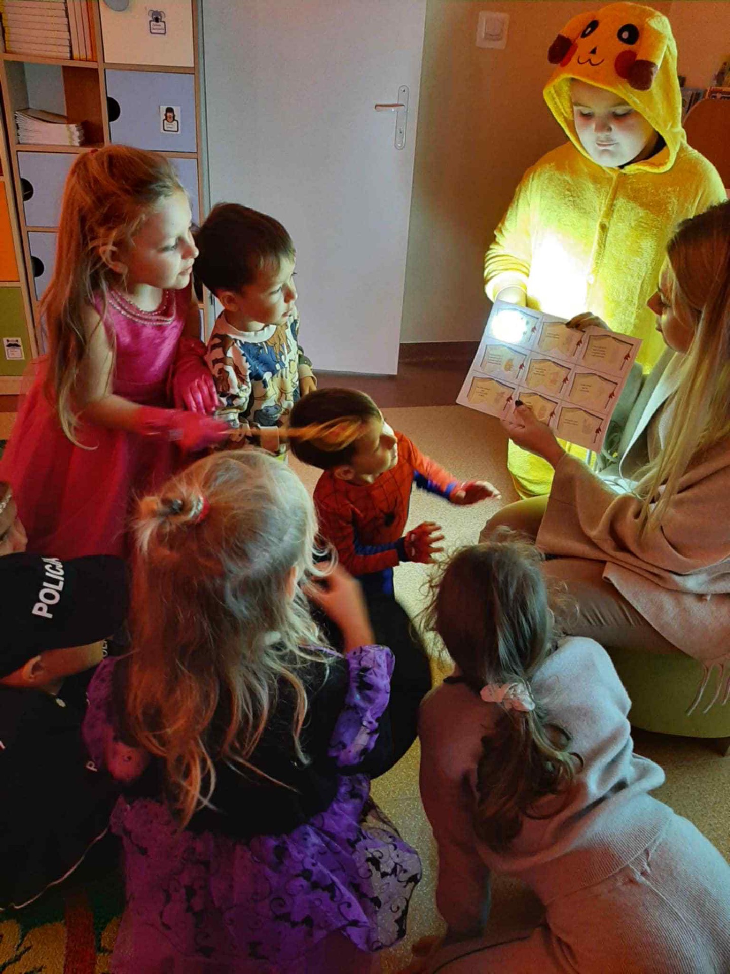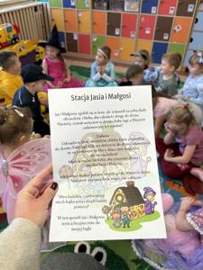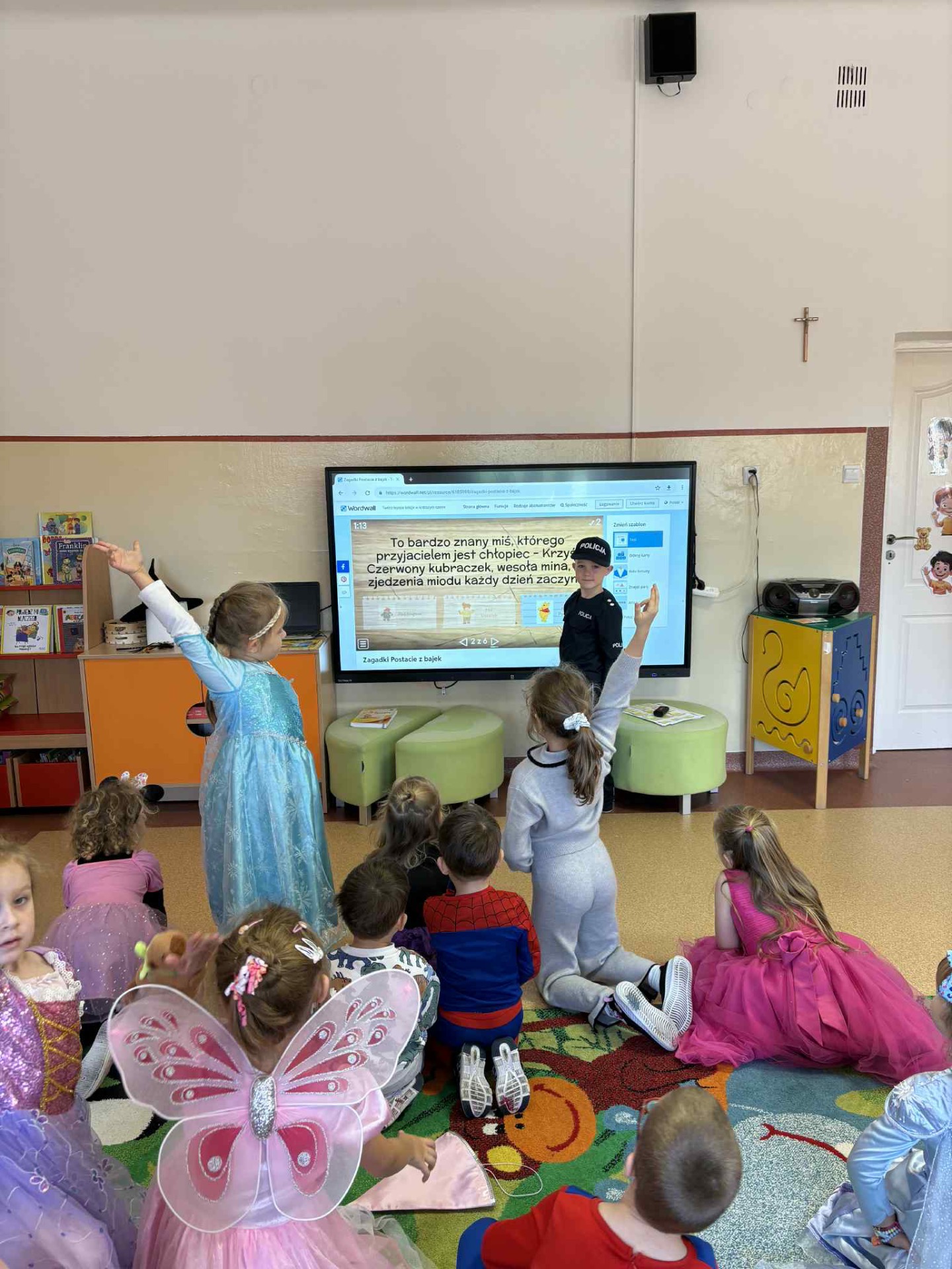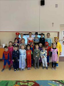 Z tej okazji dzieci przebrały się za swoje ulubione postacie z bajek. Nie zabrakło wśród nich księżniczek, wróżek, myszki Miki, policjantów, spidermanów i wielu innych. Przedszkolaki uczestniczyły w zabawie terenowej związanej ze znajomością bajek, odgadywały zagadki i rozwiązywały quizy o bohaterach bajkowych z wykorzystaniem tablicy multimedialnej, rozpoznawały także bohatera po rekwizycie oraz układały bajkowe puzzle. Ich celem było utrwalenie oraz wzbogacenie dziecięcej wiedzy na temat znanych i lubianych bajek. Na zakończenie zajęć pokolorowały bajkowe postacie. Dzieci bardzo dobrze znają bajki i świetnie radziły sobie z zadaniami.