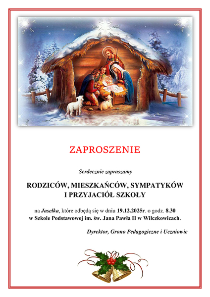 23 grudnia 2025 Aktualności 🎄 KIERMASZ BOŻONARODZENIOWY 2025 🎄 W dniach 14 i 21 grudnia 2025 r. Rada Rodziców we współpracy ze Szkołą Podstawową im. św. Jana Pawła II w Wilczkowicach zorganizowała Kiermasz Bożonarodzeniowy. Czytaj więcej